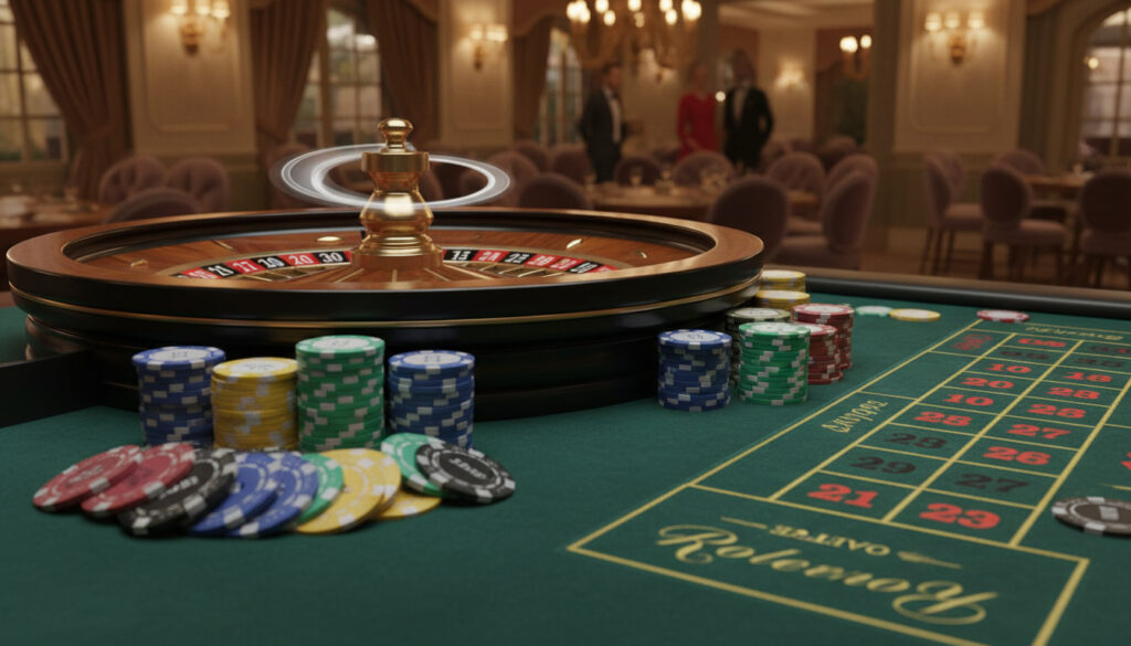 Rulettbordet viser nummerfelt, fargefelt, oddetall/partall og andre innsatstyper.
